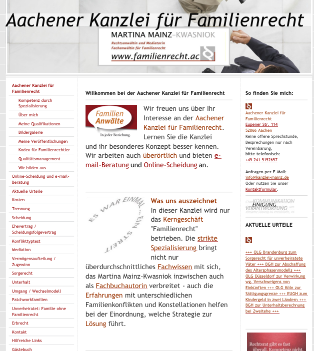 Hier gibt es nur Familienrecht - mit der Erfahrung von zwei Jahrzehnten und über 3.500 Familienfällen und der Expertenkompetenz einer Fachbuchautorin. Was kann ich für Sie tun? Die Anforderungen an mich sind so vielfältig wie meine Mandantschaft selbst. Für manche bin ich so etwas wie ein Coach im Hintergrund, andere geben mir am liebsten nur alle ihre Unterlagen ab und lassen mich die Dinge regeln. Was brauchen Sie? Entscheidungshilfe gibt es auf meiner Homepage unter "Was kann ich für Sie tun?"
